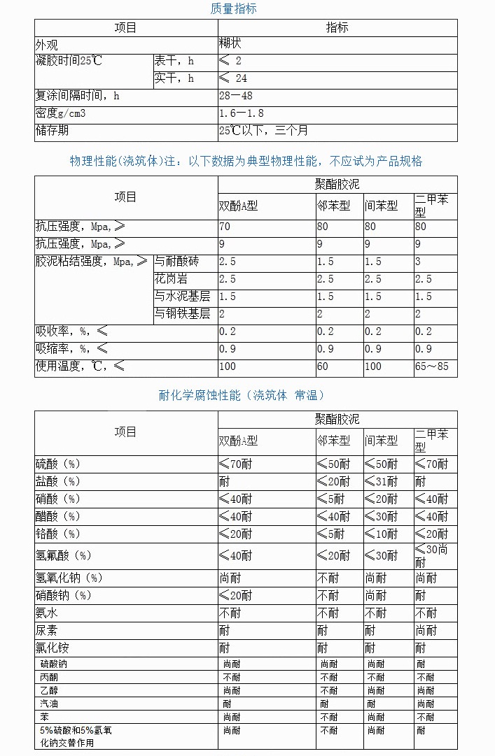 應用:適用于金屬結構和混泥土結構表面的耐腐蝕FRP防護層,各種耐酸、堿、鹽的耐腐蝕地坪及污水池、酸堿中和池、管道、貯藏、水溝或設備襯里;耐蝕整體樹脂砂漿地坪、花崗巖、耐酸磚板和粘結防腐層及聚酯膠泥勾(灌)縫等。發電廠(中和池、除鹽水箱、酸堿貯藏)鋼鐵廠(酸洗車間)冶煉廠(電解車間、制酸、電解槽內襯)化肥廠(水煤漿設備等)