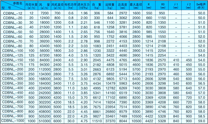 系列圓形超低噪聲逆流式玻璃冷卻塔主要參數表: